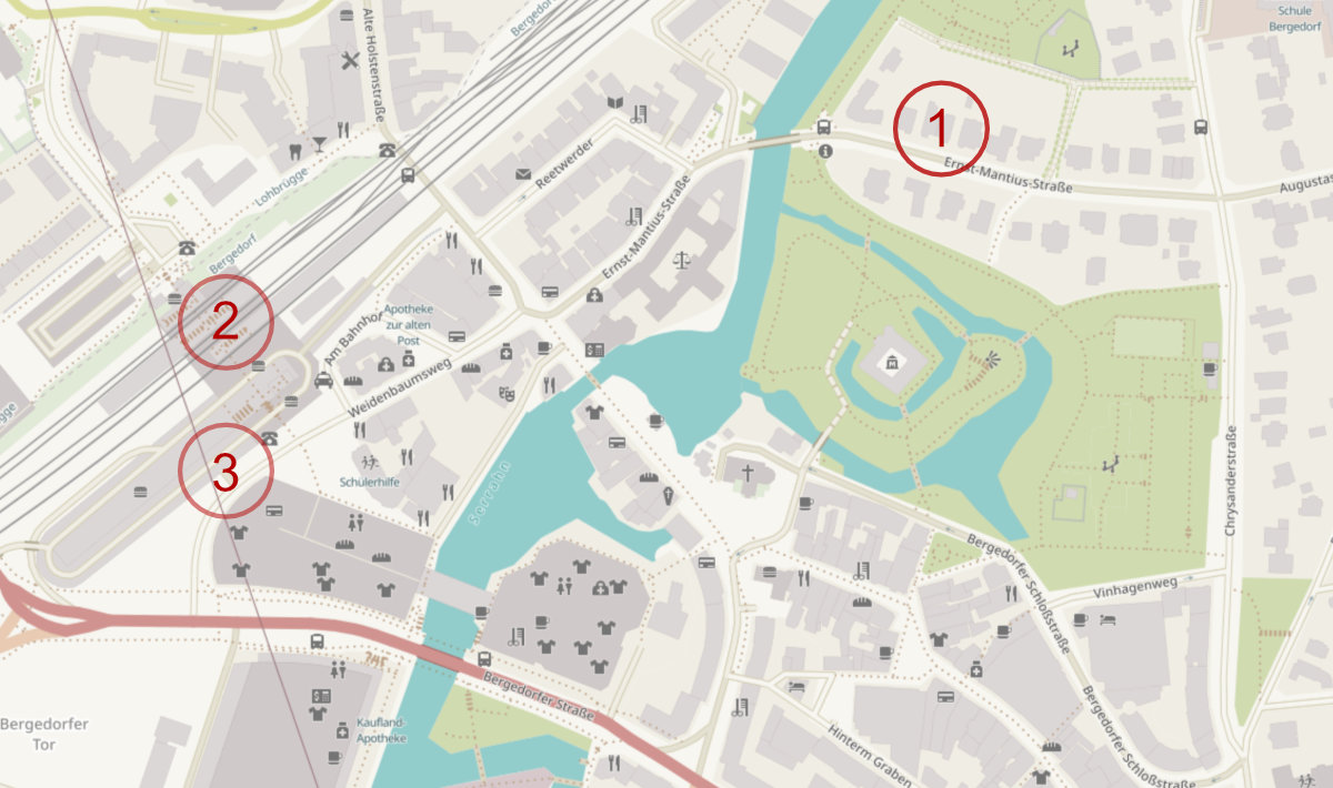 Sie erreichen meine Kanzlei (1) fußläufig innerhalb von 5 Minuten vom S-Bahnhof Hamburg-Bergedorf (2).